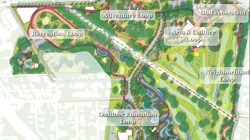 Sasaki recommends keeping golf as a key on-site program while adjusting the footprint at the edges. Its concept includes slightly shrinking the golf course by about 400 yards to accommodate additional programs to attract more people to the park.