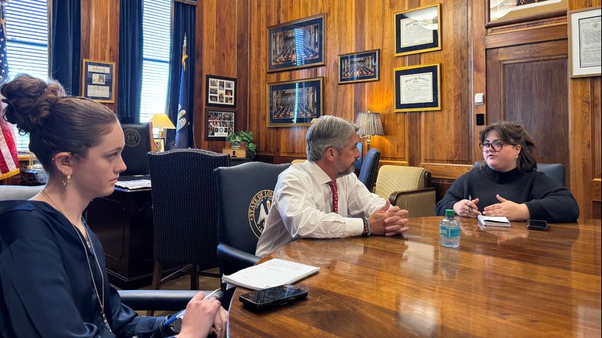 State Senate President Cameron Henry answers questions from the LSU Manship School News Service reporters Avery White and Gracie Thomas in his office.