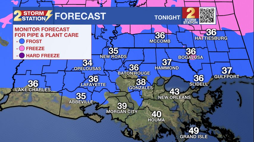 Tonight & Tomorrow: After showing no signs of breaking earlier in the day, low clouds finally gave way quickly after lunchtime. This will set up a mostly clear to partly cloudy evening, allowing temperatures to quickly drop out of the 50s and into the 40s. Clear skies overnight would let temperatures fall into the mid-30s, setting the stage for frost along and north of I-10 and perhaps some patchy fog. But if low clouds sneak back in and hang around, frost chances diminish, becoming patchier in nature. In any case, be sure to protect plants from the potential of a killing frost, and don’t forget people and pets. Tuesday will be a sunnier day overall, and a little warmer, with highs near 60°.