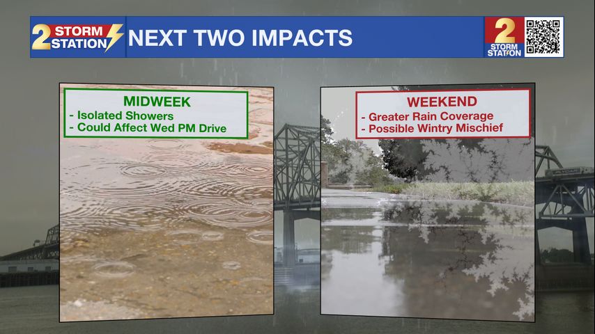 Tonight & Tomorrow: Expect another cold night ahead, although temperatures won’t fall as low as they have over the past two nights. Thermometers will fall through the 40s during the evening and drop into the 30s after midnight. By daybreak, lows will settle near or just below freezing along and north of I-12, while areas farther south stay in the mid-30s. Take steps to protect plants, keep pets warm, and wear layers before heading outside — nothing unusual for the time of year. Tuesday looks similar to Monday, with highs near 60°. Thin, high clouds will appear throughout the day, signaling the first signs of midweek changes.