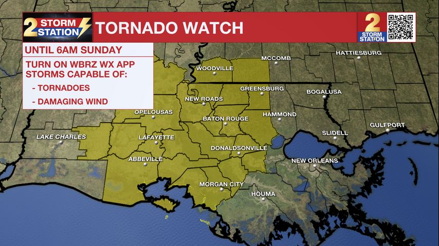 The National Weather Service has issued a ***TORNADO WATCH*** for East Baton Rouge, West Baton Rouge, Ascension, Assumption, Iberville, East Feliciana, Livingston, Pointe Coupee, St. Helena, St. James, St. Mary, and West Feliciana Parishes, as well as Amite and Wilkinson Counties until 6 a.m. Sunday.