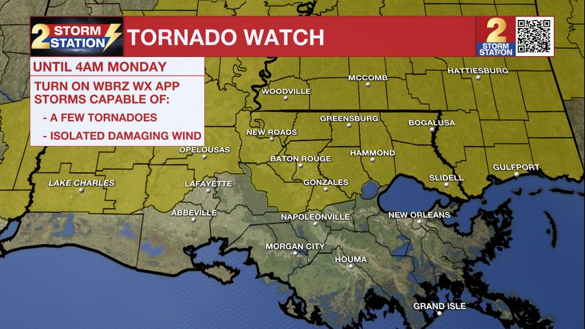The National Weather Service has issued a Tornado Watch for East Baton Rouge, West Baton Rouge, Ascension, Iberville, East Feliciana, Livingston, Pointe Coupee, St. Helena, Tangipahoa, and West Feliciana Parishes, as well as Amite and Wilkinson Counties until 4 a.m. Monday.