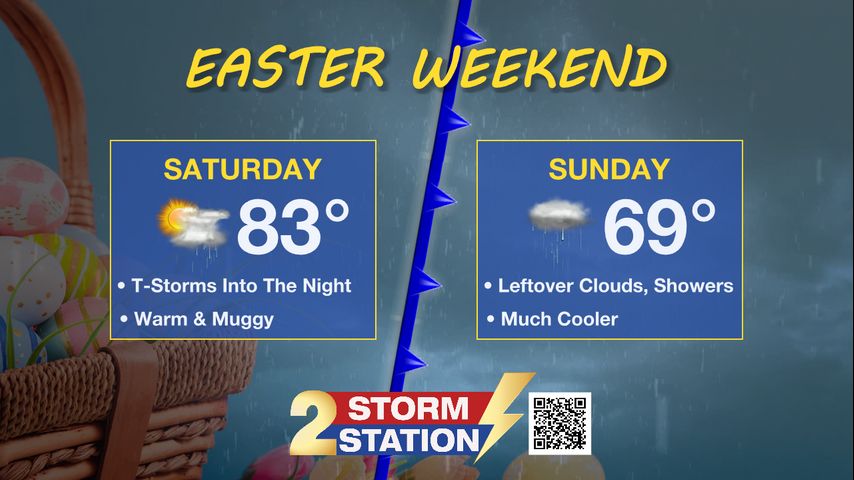 Up Next: Saturday will stay warm and humid ahead of an approaching cold front. After highs in the low 80s, showers and thunderstorms are expected to pick up in coverage later Saturday afternoon into the night, marking the beginning of a significant weather pattern shift. Early on Easter Sunday—perhaps before dawn—the cold front will push through, bringing a batch of rain and thunderstorms. The timing and speed of this front remain a bit uncertain, which will directly influence how long the rain lasts. Prepare an indoor backup option in case of straggling showers. Rain or not, the second half of the weekend will be mainly cloudy and cooler with temperatures considerably lower behind the front, in the mid to upper 60s.