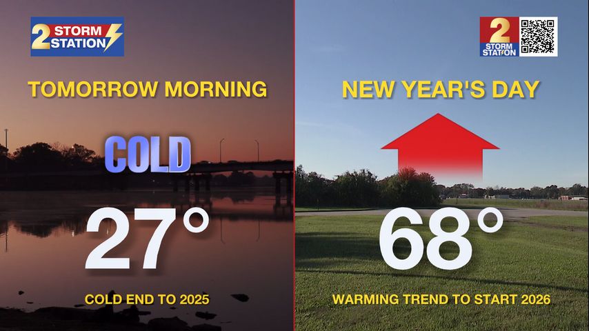 Up Next: Cold air won’t stick around much longer as temperatures steadily trend upward through the week. Overnight lows will rise above freezing, while afternoon readings climb back near 60° by New Year’s Eve and approach 70° on New Year’s Day. By Friday, highs are expected to reach the mid-70s. That warmth sets the stage for the next cold front, which could spark a few isolated showers or storms late Friday into Saturday. Overall, this front appears weak, with only a short-lived and minor cooldown expected for the weekend.